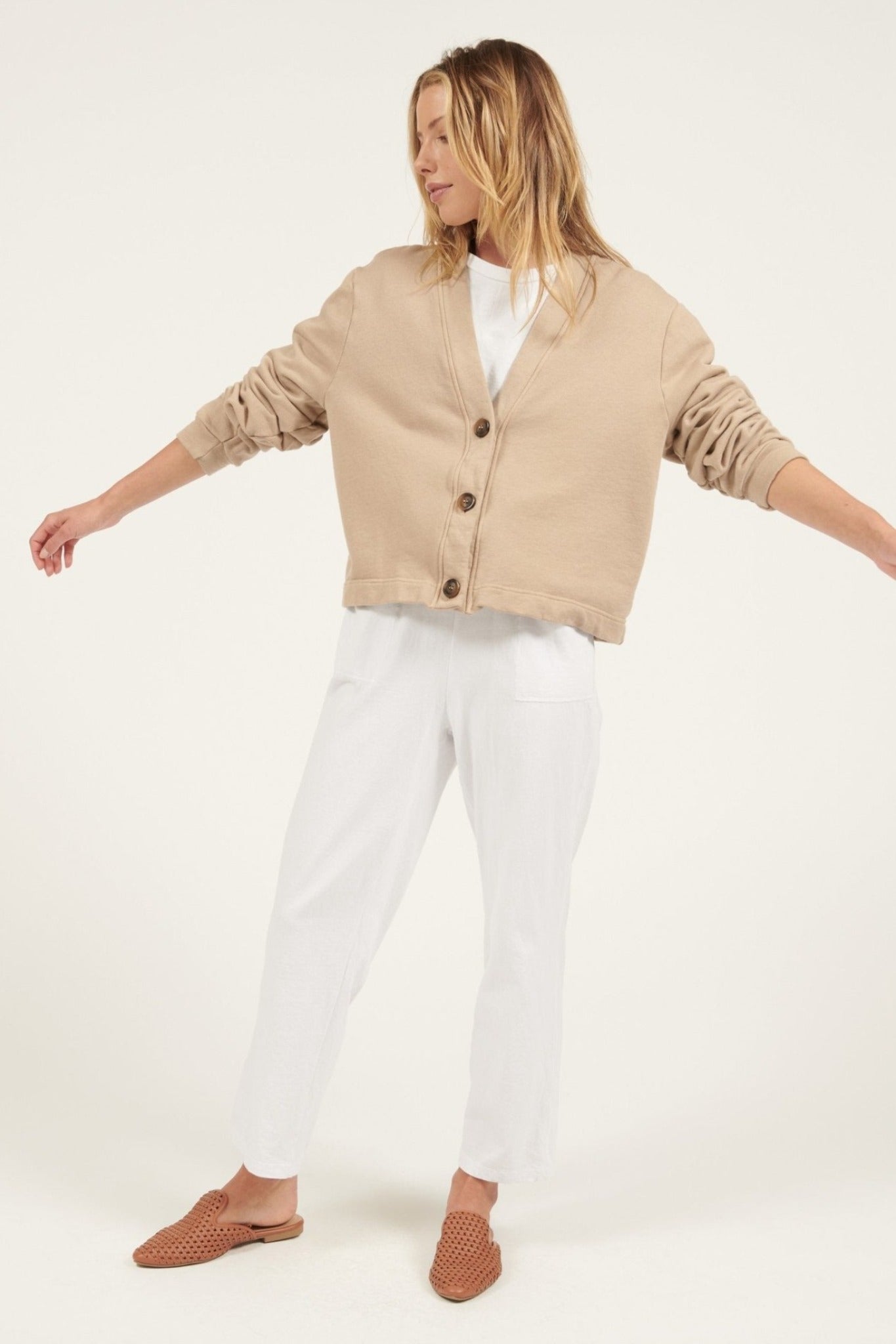 A new season favourite, the Binxy Jacket is a trans-seasonal must have. Boasting a fleecy looped cotton to keep you cosy. A loose fit that makes Binxy perfect for layering during the cooler months. Three beautiful tortoiseshell buttons. Twin needle hemline and sleeve edge. Dropped shoulders and a cropped cut. Wear on its own or layered with your favourite basic. This jacket will be on high rotation.