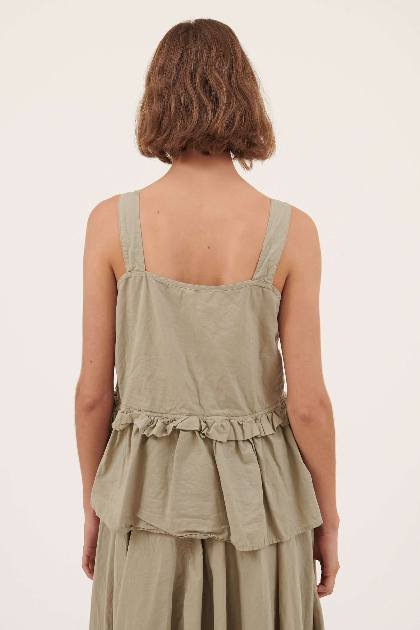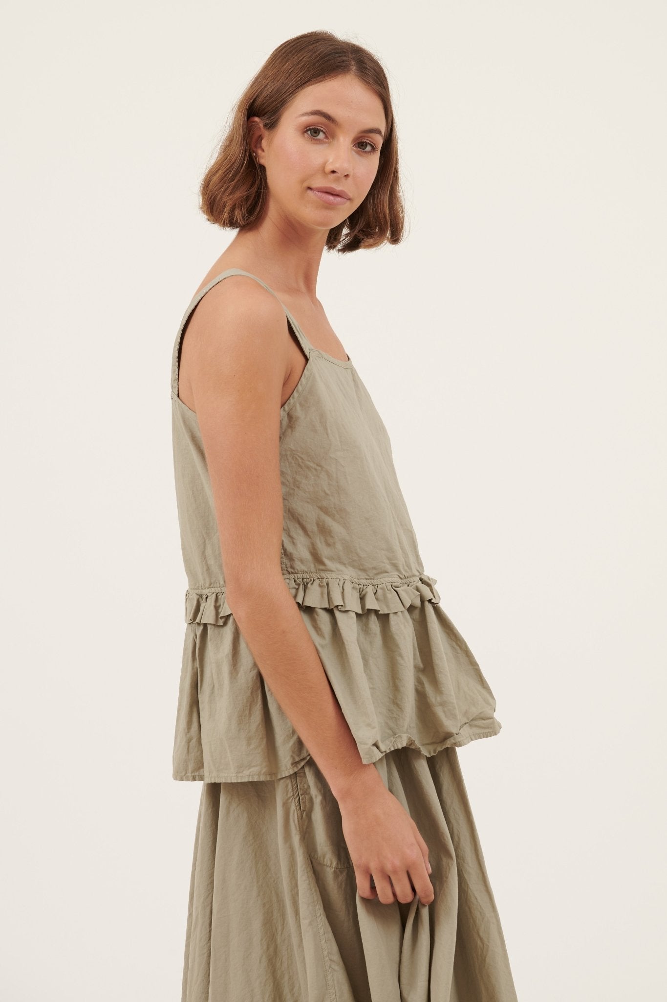 The Byron Sunsets Tank is a simple a-line shape. Featuring a gathered tier with a ruffle insert on the front and back. Wide fixed straps for bra-coverage, slight rounded neckline. All beautifully constructed with french seams and top stitching. Non-iron. Double neaten hemline.