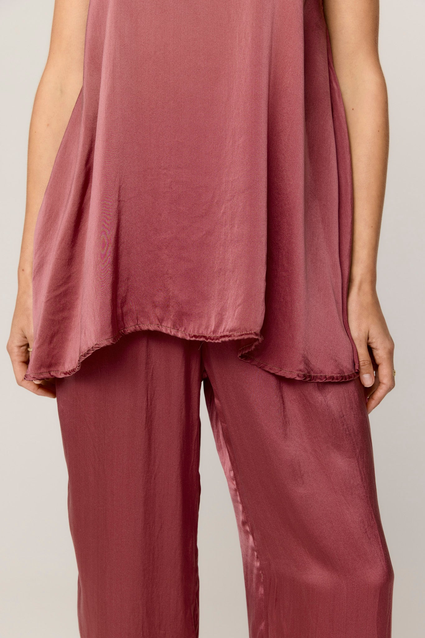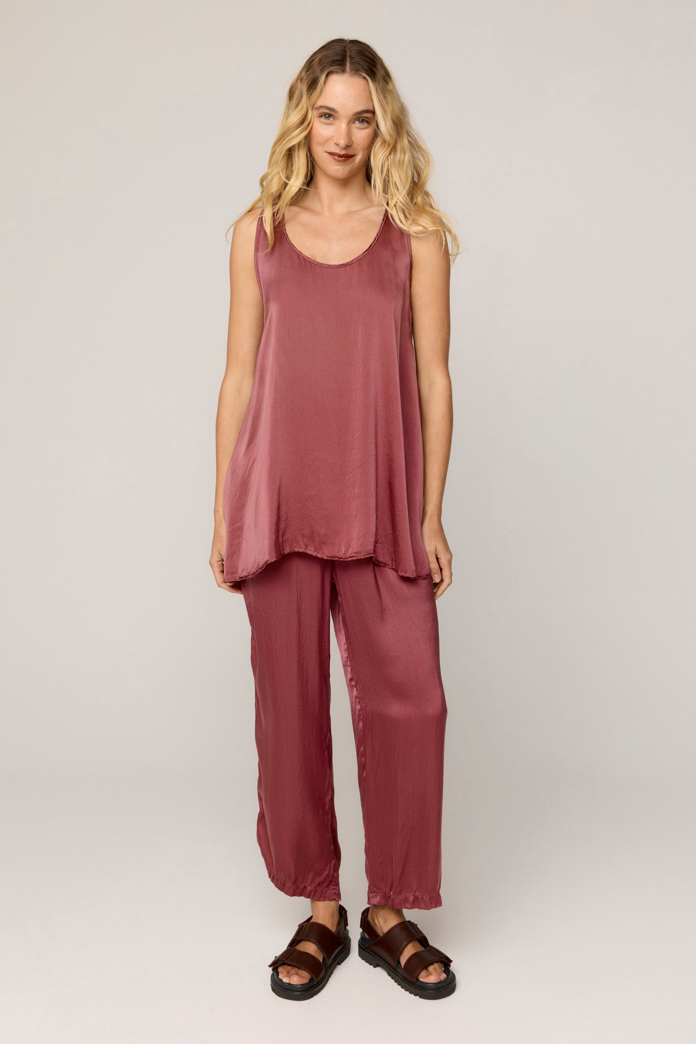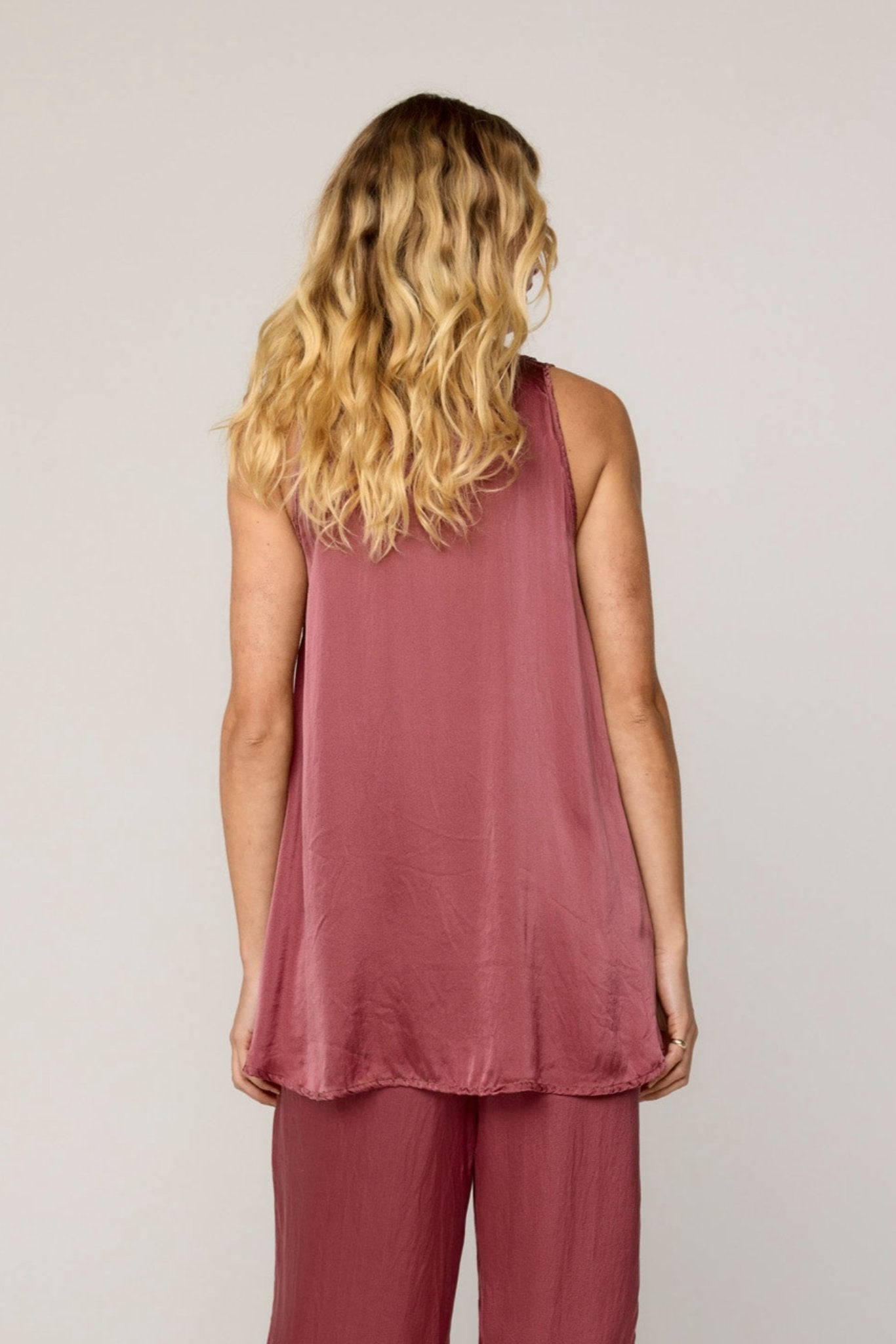 The Des Tank is a beautifully constructed satin silk, loose fitting tank. Featuring a flattering a-line shape and a scooped neckline. French seamed and top stitched for the ultimate finish. Wider straps for bra coverage. Double neatened hemline, long-line silhouette with binding on the armhole and neckline. Versatile, flowing, and ready to move with you. Style with the Des Pant or Bias Skirt.