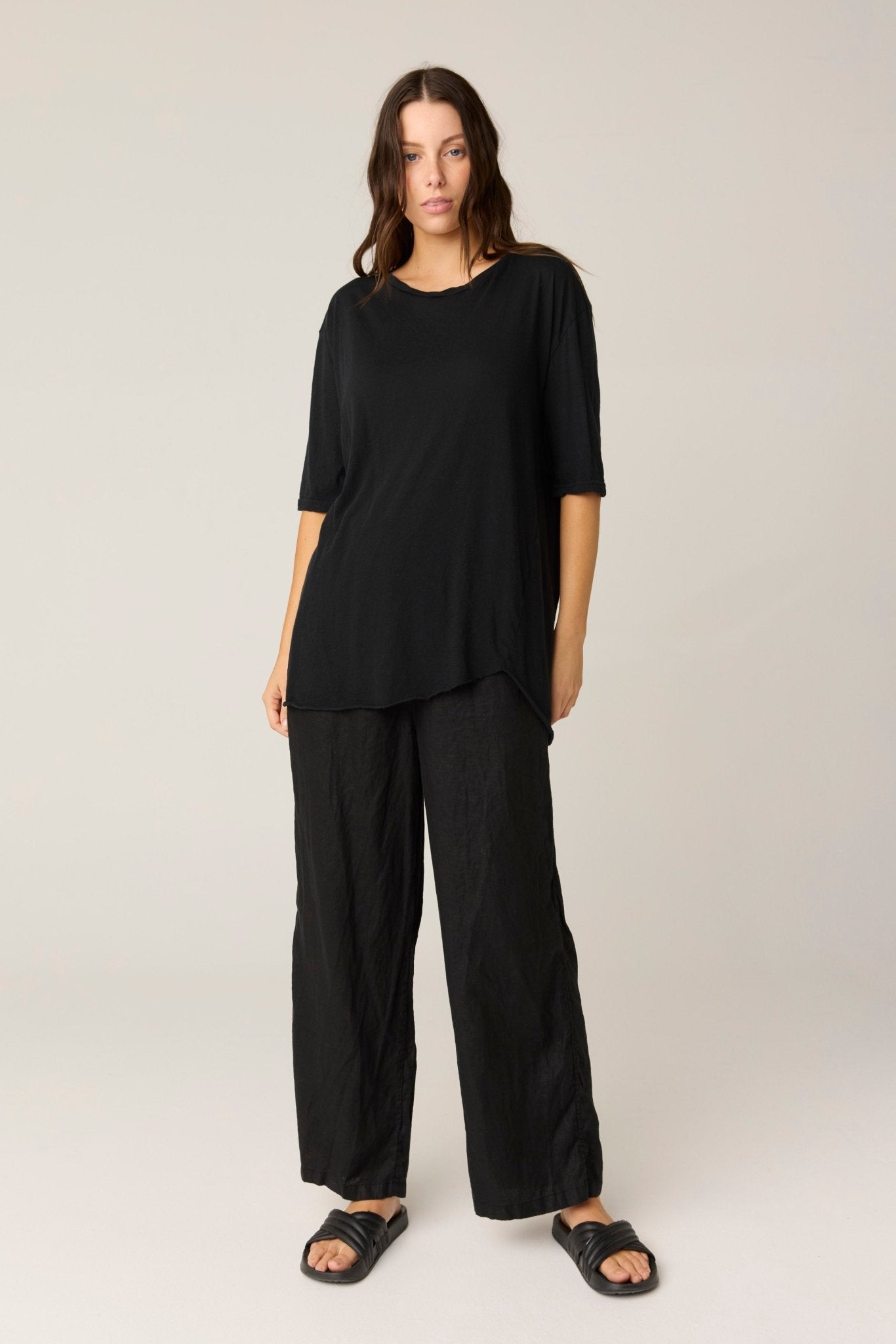An elevated classic, the Hap Tee. A short sleeve ultra-soft cotton top with rounded neckline. Twisted neckband detailing. Relaxed fit. Asymmetric hem with raw edges and a slight twist. Natural stretch. Double needle sleeve cuff. Slight dropped shoulder.