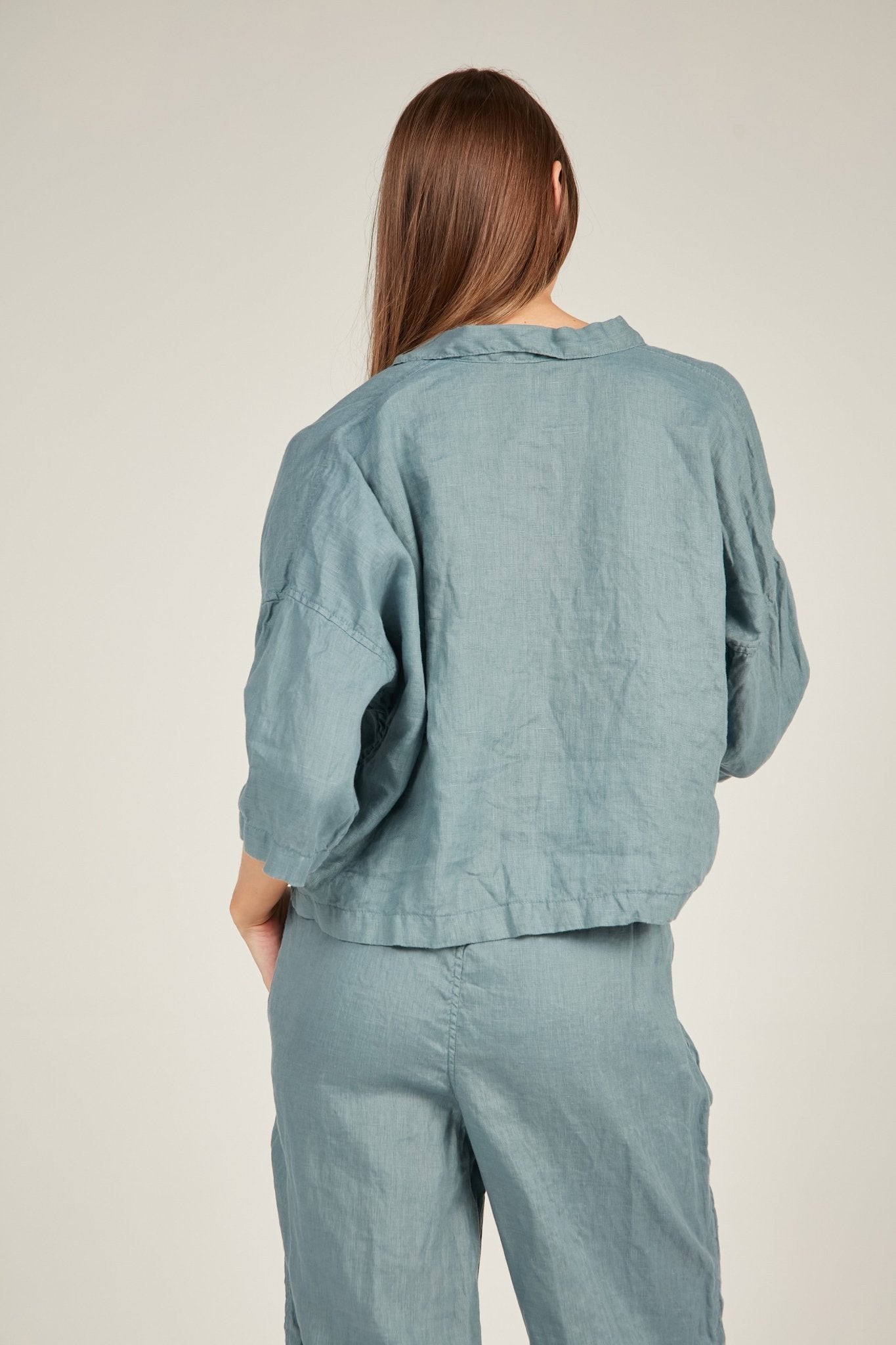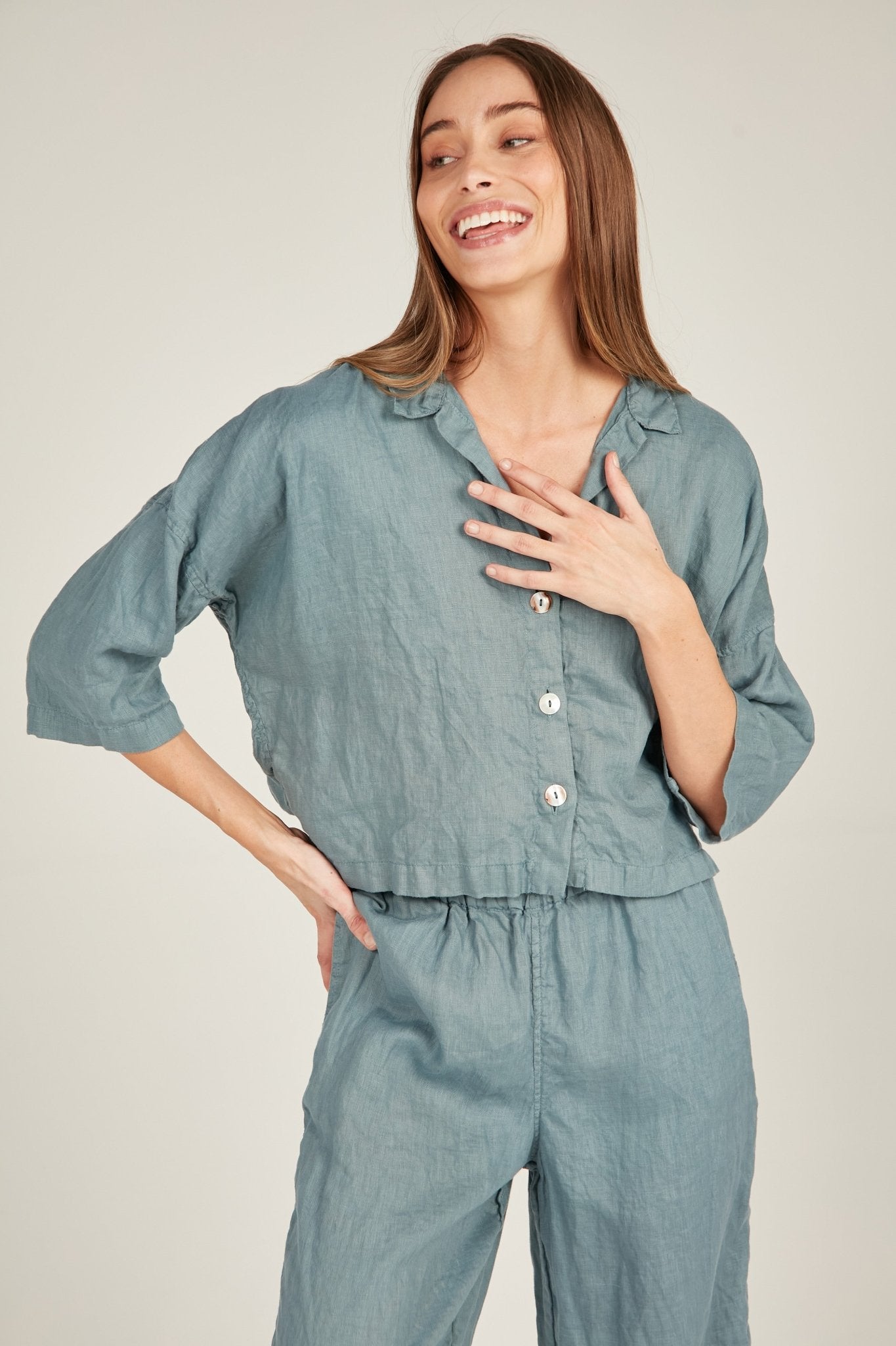 The Island Shirt is a relaxed button up with a classic style collar. Boasting a wide body and cropped length which falls dreamily on the body. Natural shell buttons with a dropped shoulder sleeve. French seamed and top stitched for a premium finish. Pairs perfectly with the Island Pant for the ultimate linen set.