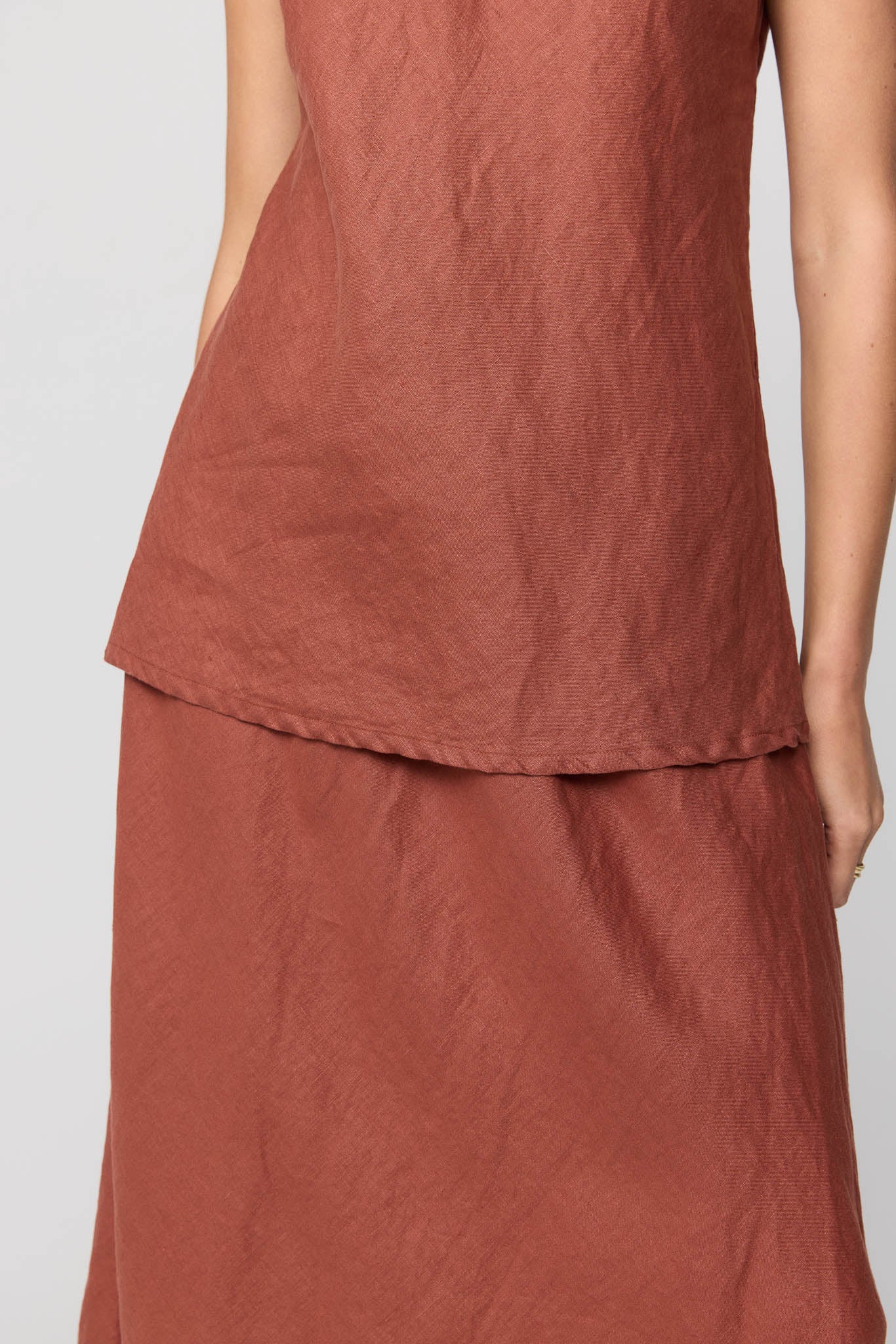 The Palm Tank is cut on the bias creating the most flattering fit. The linen fabric falls perfectly giving the body the right amount of swing and shape. Featuring two back darts and a sculpted v-neckline. Beautifully french seamed and top stitched for a premium finish. Double neatened hemline and simple binding on the armhole and neckline. Pairs perfectly with the Palm Bias Skirt.
