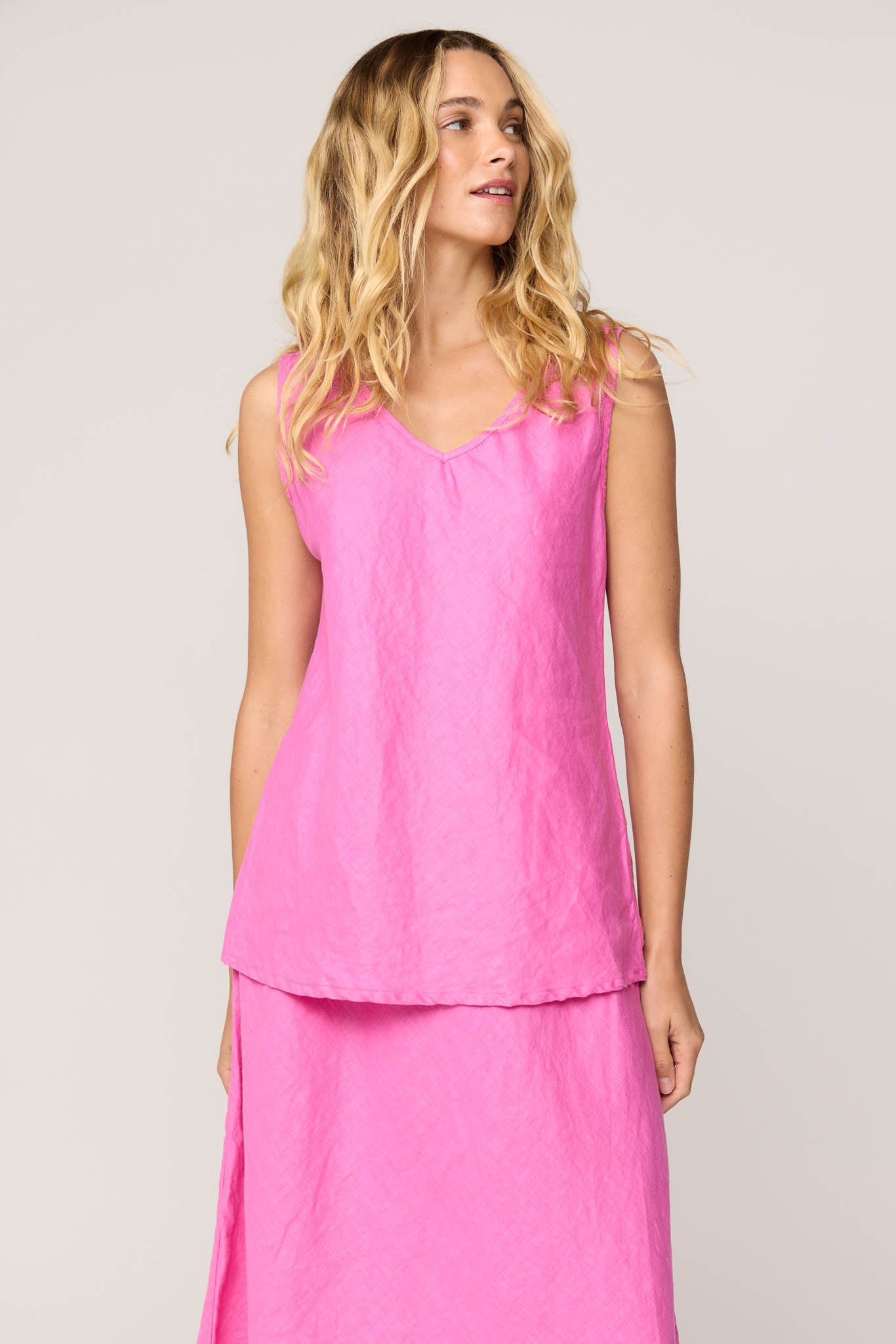 The Palm Tank is cut on the bias creating the most flattering fit. The linen fabric falls perfectly giving the body the right amount of swing and shape. Featuring two back darts and a sculpted v-neckline. Beautifully french seamed and top stitched for a premium finish. Double neatened hemline and simple binding on the armhole and neckline. Pairs perfectly with the Palm Bias Skirt.